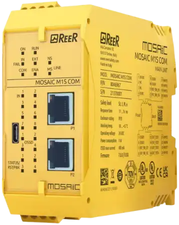 De ReeR Mosaic-serie is een modulair en flexibel veiligheids-PLC-systeem ontworpen voor industriële automatiseringstoepassingen. Het systeem biedt een breed scala aan veiligheidsfuncties, eenvoudige configuratie met de gratis Mosaic software en ondersteuning voor diverse communicatieprotocollen. De Mosaic-serie voldoet aan internationale veiligheidsnormen zoals ISO 13849-1 en IEC 62061, wat betrouwbaarheid en veiligheid garandeert in veiligheidskritische situaties.